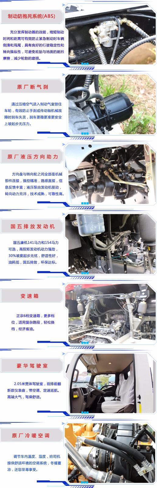底盤配置:該車才用福田康明斯154馬力發(fā)動(dòng)機(jī)(歐五排放標(biāo)準(zhǔn)帶尿素罐),6檔手動(dòng)變速箱,3800mm軸距,7.50R16鋼絲胎,氣剎,帶冷熱空調(diào),帶離合器助力,帶方向助力,帶定速巡航功能,2.05米寬體駕駛室。總質(zhì)量:7噸,車身自重4.8噸。